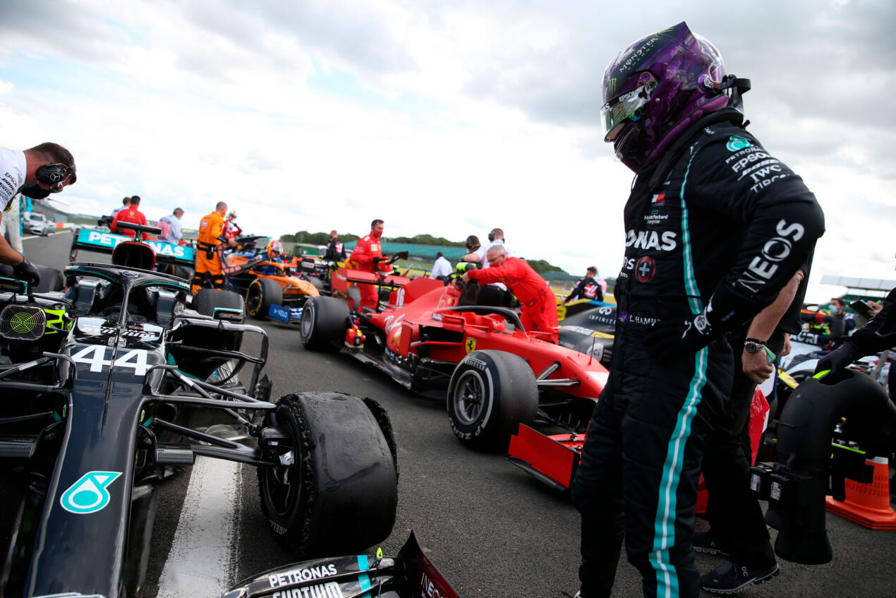 _ FÓRMULA UNO GP DE INGLATERRA 2020 L O __A C O N T E C I D O CON SÓLO TRES RUEDAS Y LLEGA A LA META Gana Hamilton en su patria El exceso de confianza en las gomas Pirelli hace un merequetengue en el cuarto GP de la temporada. Lewis