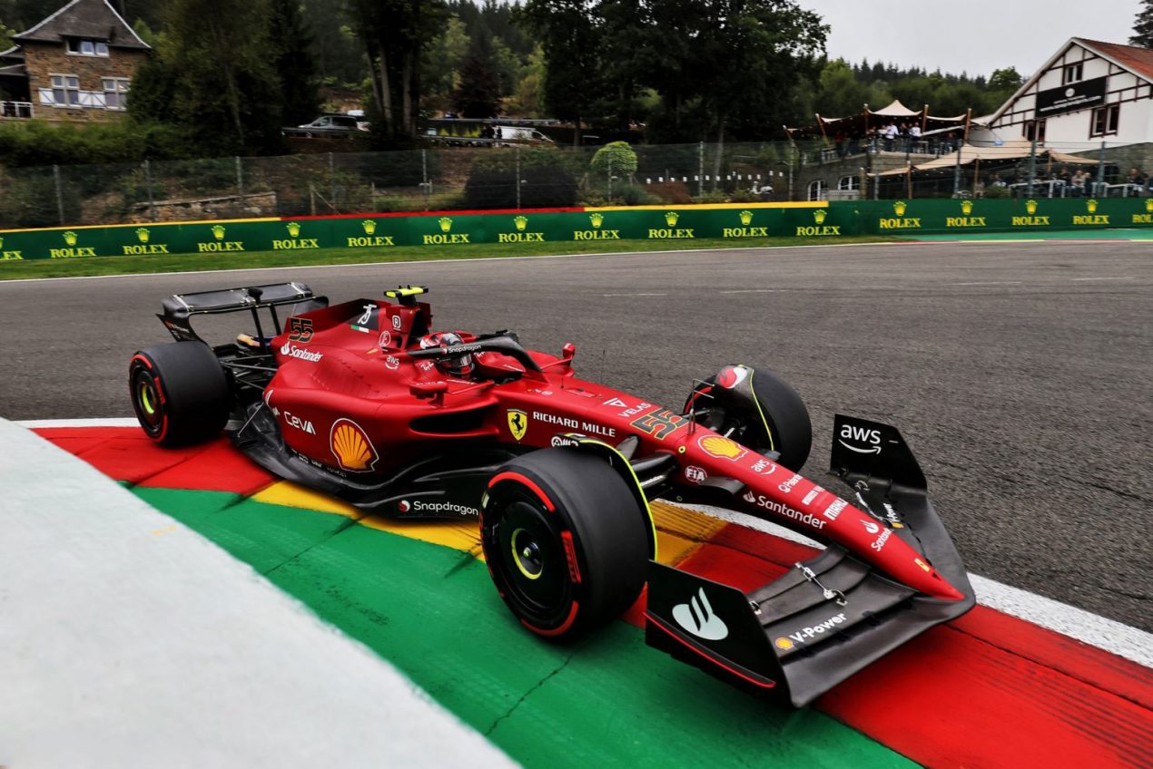 _ _ Fórmula 1 GP DE BÉLGICA 2022 P R I M E R A P R Á C T I C A L I B R E EL LÍDER ES S A I N Z En el doblete de Ferrari Al empezar las actividades del GP belga. Para no variar, con lluvia. El