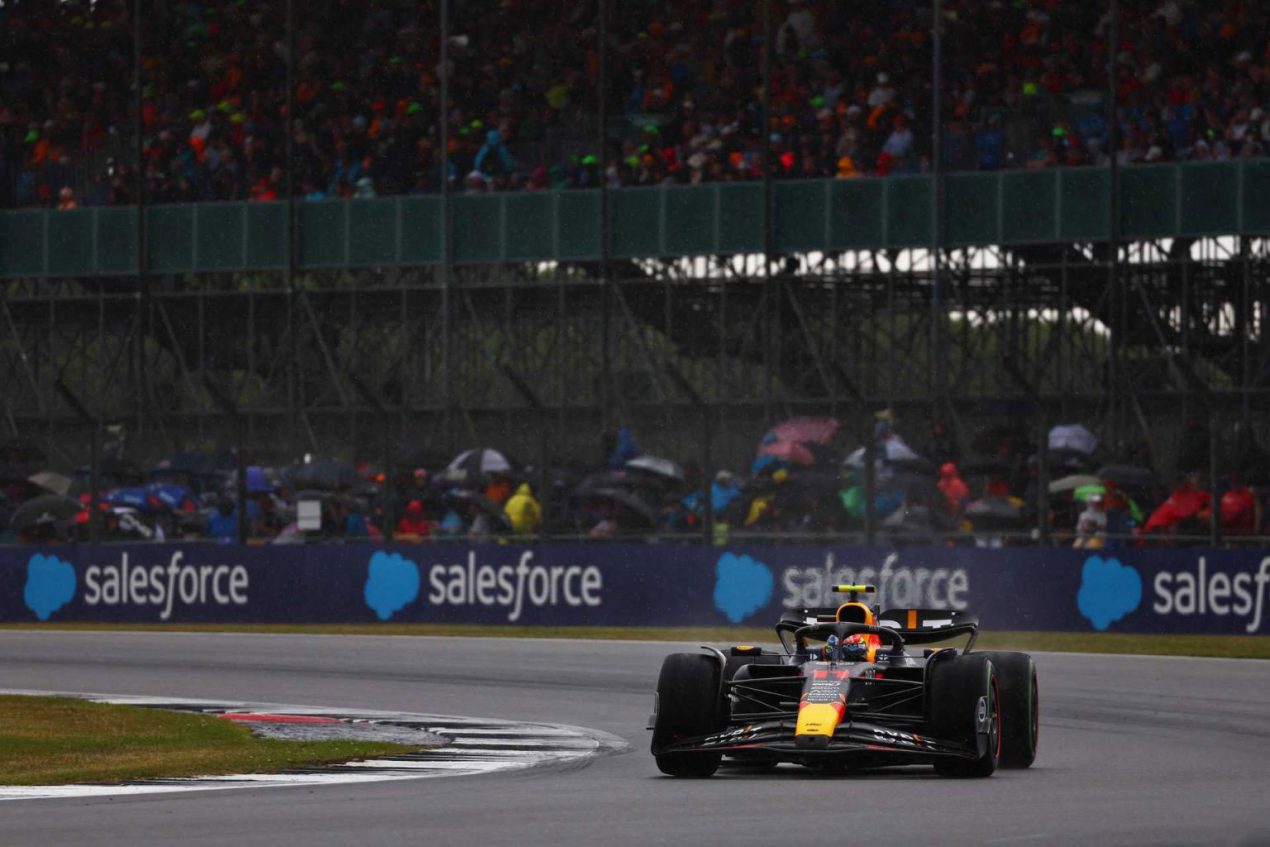 _ _ FÓRMULA UNO GP DE INGLATERRA 2023 1ª M A N G A NUEVO FALLO DE S E R G I O P É R E Z No pasa el primer corte Norris, Leclerc y Russell con los mejores cronos. Verstappen quinto. Las condiciones estaban difíciles para todos. La pista cambiante demandaba ser