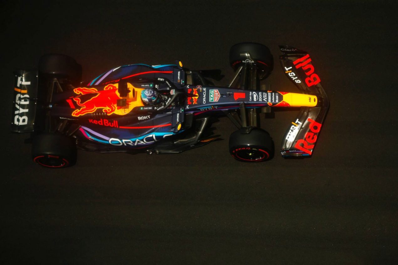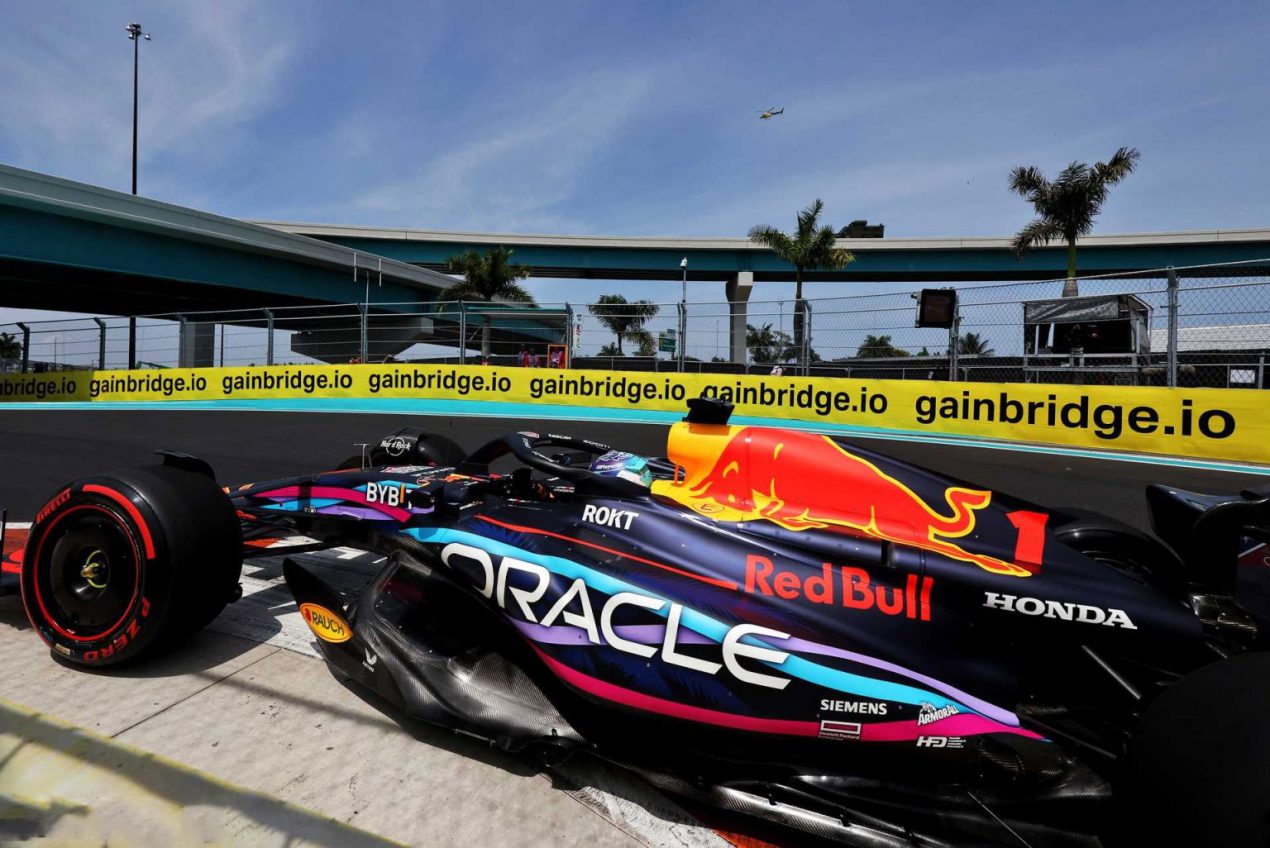 _ _ FÓRMULA UNO GP DE MIAMI 2023 M A N G A I N T E R M E D I A EL PRIMER PILOTO DE R E D B U L L Impone la pauta Verstappen. Inalcanzable para el resto. Leclerc de Ferrari es segundo. Alonso con su Aston, detrás.